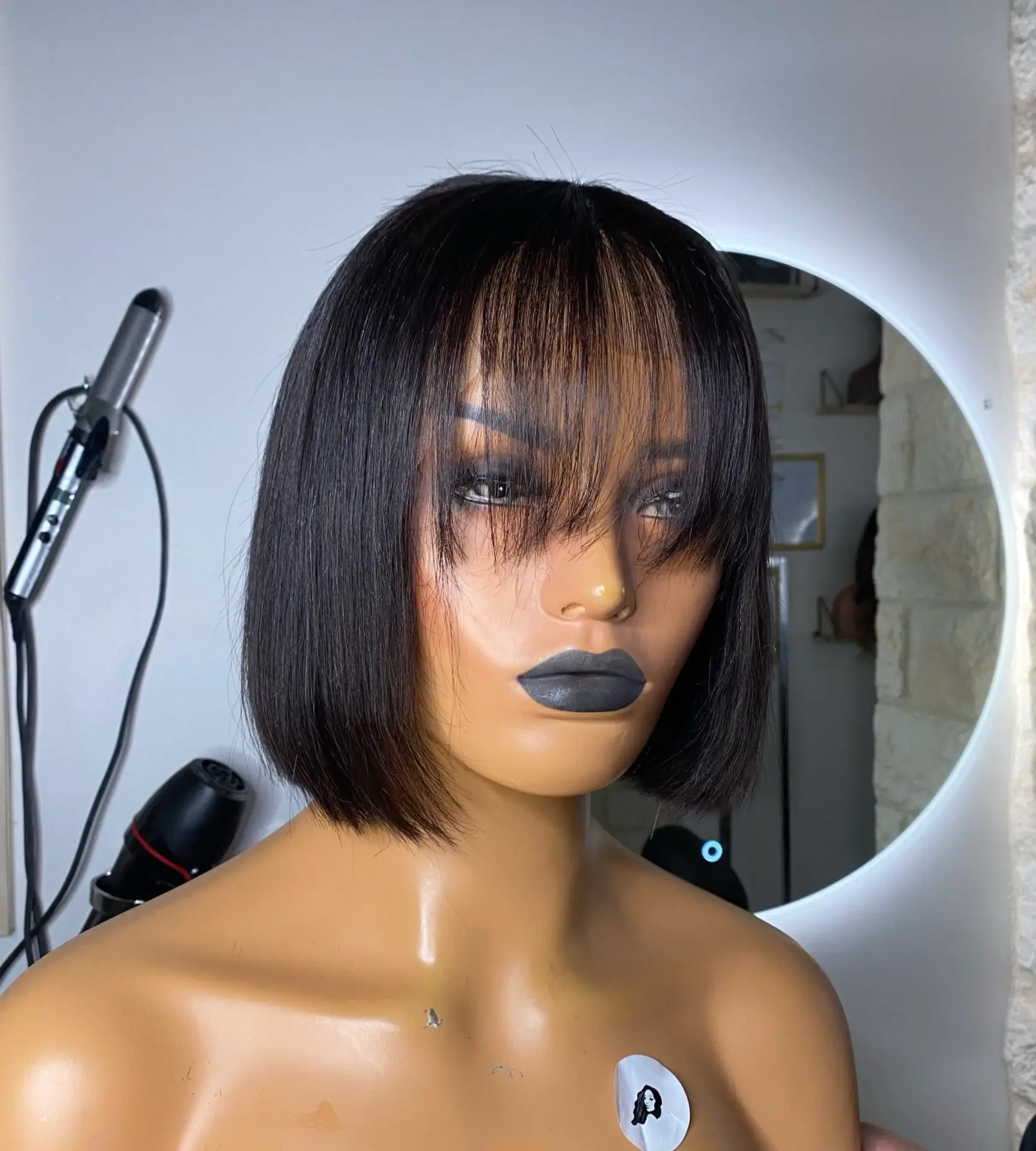 Perruque lisse Malaisienne remy hair confectionnée en usine :- Densité (l’équivalent de 2 paquets de + une lace frontal ) – Cheveux sains et résistants. – Elastique band fournie. – Lace transparente, elle s’adapte à toutes les carnations.. – Frange droite – Perruques pré customiser – Couleur de cheveux: Couleur noire naturelle 1B , elle peut être teintée et blanchie.   La frange est un type de coiffure où les cheveux du toupet retombent sur le front.